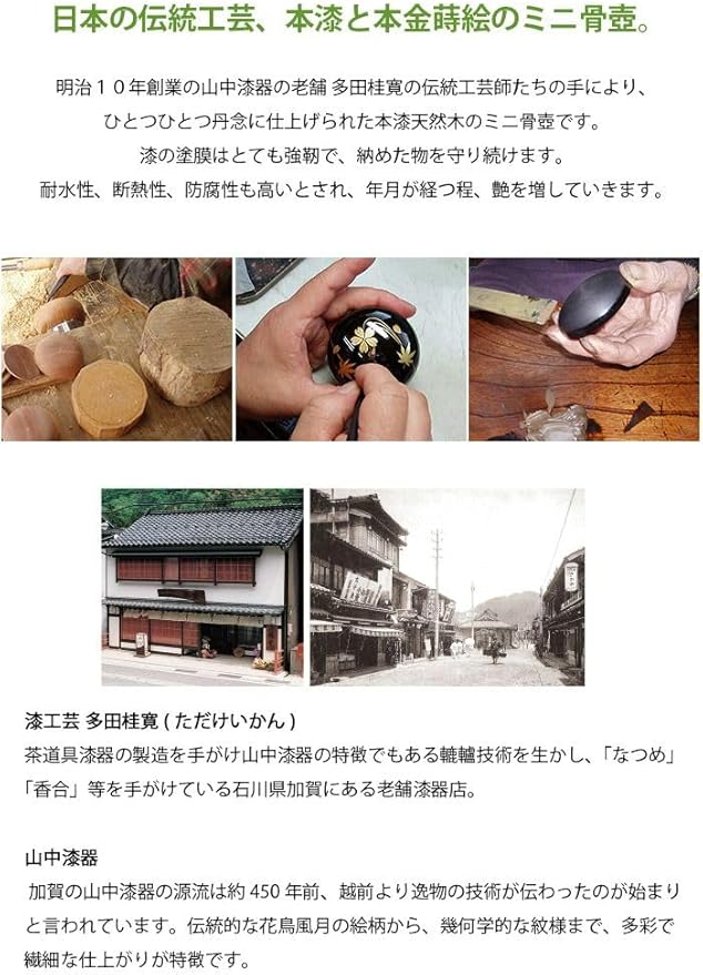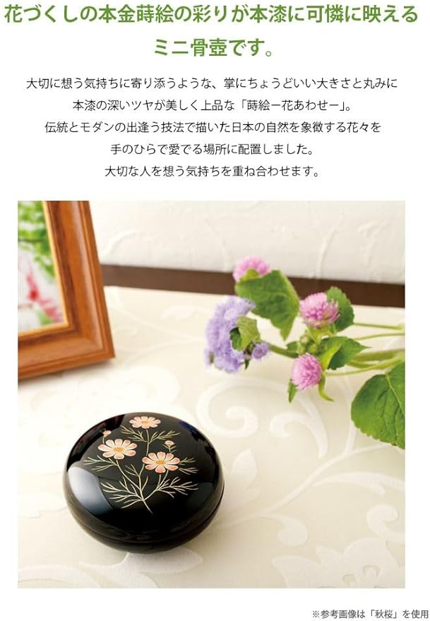 ソウルプチポットは、大切な方のご遺骨や遺灰、形見の品を、想いと共に納めることのできる器。手元供養のトップブランドであるSoulJewelry(ソウルジュエリー)だから実現できる、様々なライフスタイルやインテリアにマッチするミニ骨壺です。「ソウルプチポット 蒔絵花あわせ」は、木製のミニ骨壷。大切なものを納めておくために古来より使われてきた「漆」は、英語で「JAPAN」と呼ばれ、 世界的に認められた日本古来の伝統工芸。漆塗が持つ塗膜は耐水性・防腐性に優れる上に、その表面は時が経つ程にツヤを深め、味わ