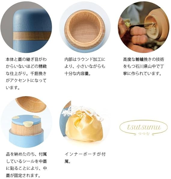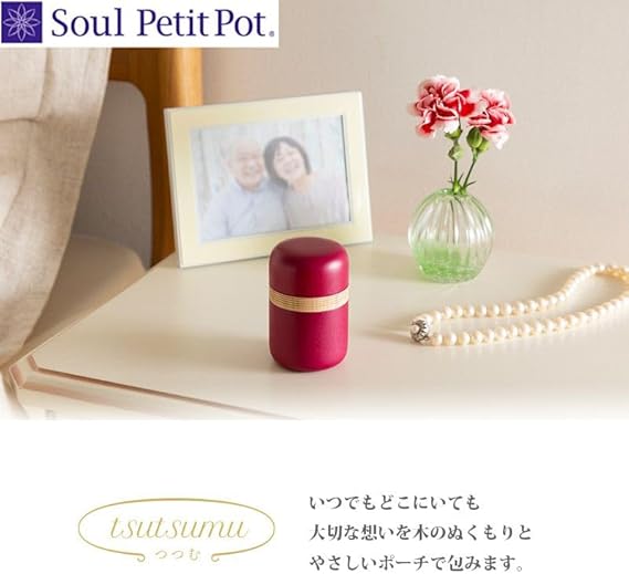 ソウルプチポットは、大切な方のご遺骨や遺灰、形見の品を、想いと共に納めることのできる器。手元供養のトップブランドであるSoulJewelry(ソウルジュエリー)だから実現できる、様々なライフスタイルやインテリアにマッチするミニ骨壺です。「ソウルプチポット つつむ」は、木製のミニ骨壷。木製プチポットと携帯用巾着ポーチがセットになった商品です。明治創業・450年以上の歴史を誇る石川県加賀市「山中漆器」の高度な「轆轤挽き」の技法により、職人が一つひとつ丁寧に仕上げています。本体と蓋の継ぎ目が分からない