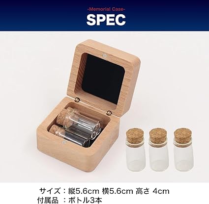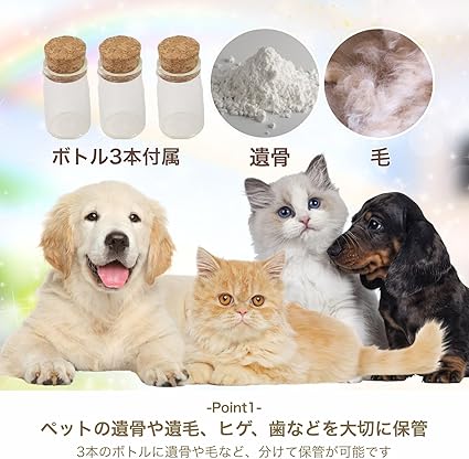 3本のボトル付きで、遺骨や遺毛、歯、骨、ヒゲ、爪など、遺品を分けて