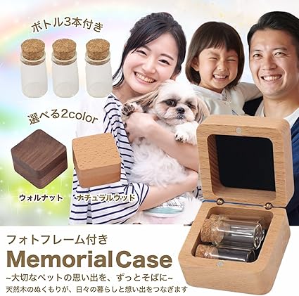 大切なペットとの思い出をいつまでも大切に保存するためのメモリアルケースです。写真と遺毛、遺骨、ヒゲ、牙などの遺品を一緒に保存できます。