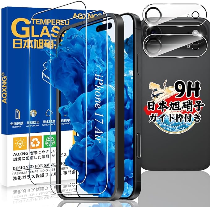 【ガイド枠付き】 対応 iPhone 17 Air ガラスフィルム 2枚 + カメラ保護 2枚 【4枚セット 日本旭硝子製】 いphone17Air 用 フィルム 強化ガラス アイホン17Air 用 保護フィルム ケース 硬度9H 耐衝撃 飛散防止 高感度タッチ 指紋防止 撥油性 疎水性 自動吸着 気泡ゼロ 貼り付け簡単 a