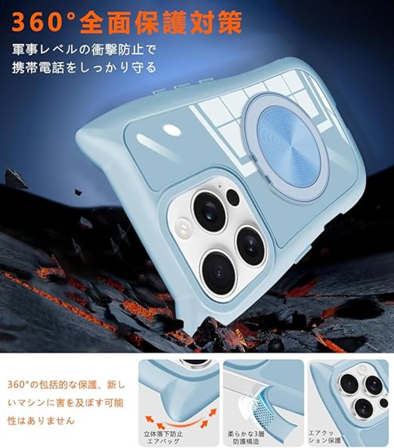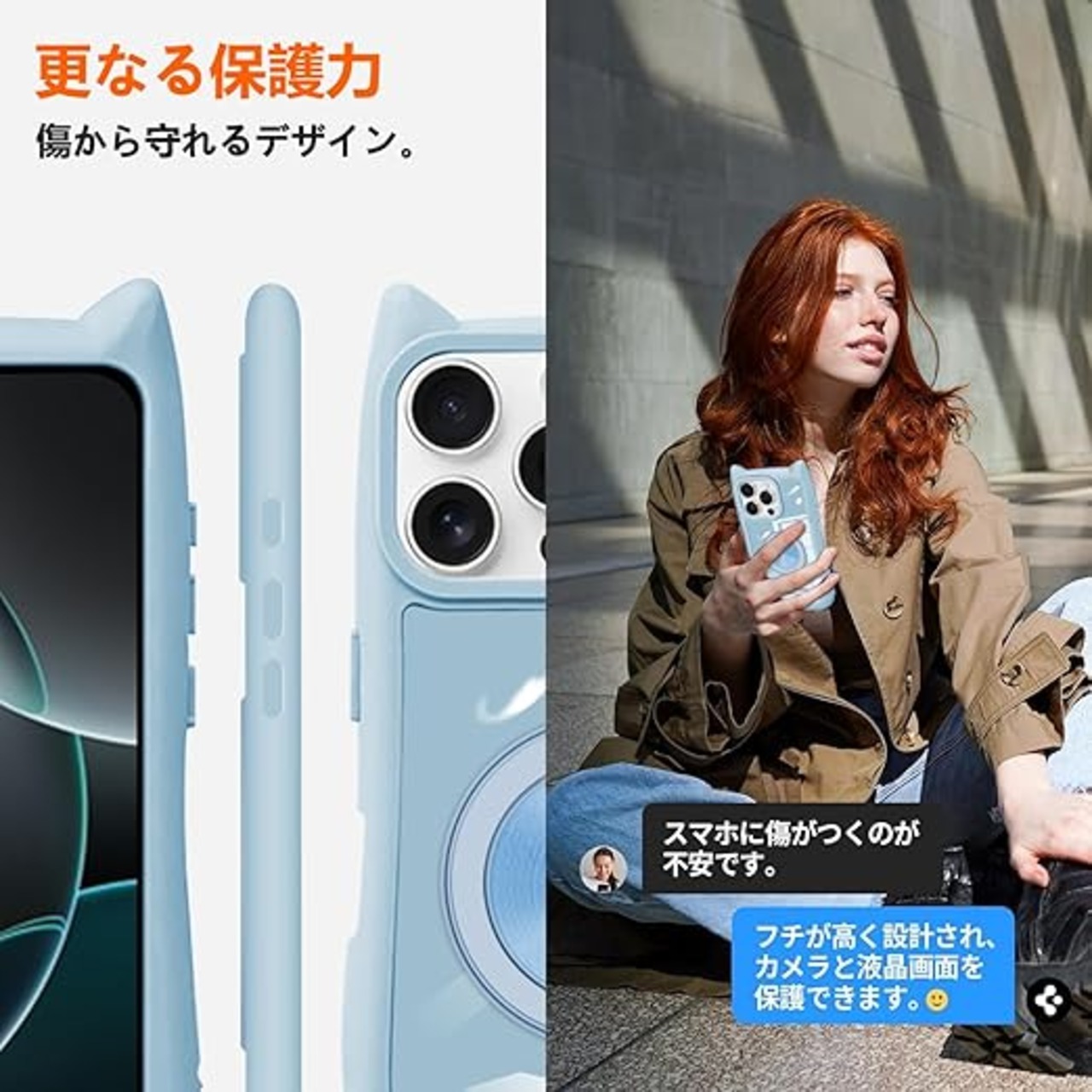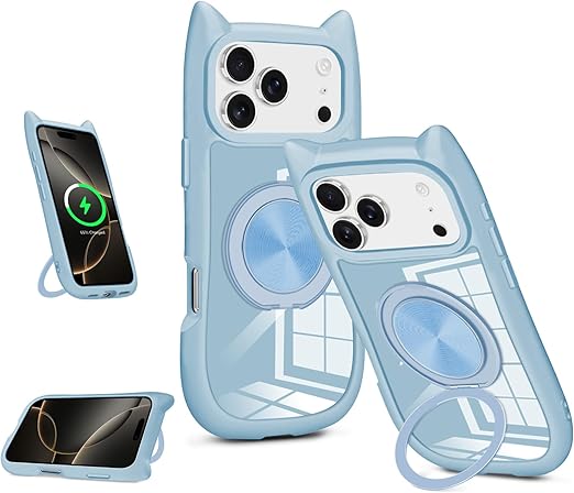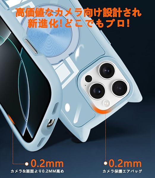 iPhone 17 Pro Max 用 スマホケース 猫耳デザイン シンプルでファッション 360° 回転スタンド付き 軽量 ダンパー 携帯に便利 耐衝撃性 iPhone 17pro max スマホケース マルチアングルビュー 滑り止め 黄ばみ防止 全面的な保護 a