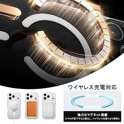 【ワイヤレス充電・強力マグネット】ケースには強力な磁石が内蔵されており、各種マグネットアクセサリーをしっかりと吸着します。ワイヤレス充電機能に対応し、置くだけで充電が可能で、充電効率が高く見た目も洗練されています。