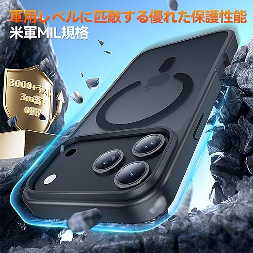 Eiffebill iPhone 17 Pro ケース, カメラ保護フィルム付き, MagSafe 対応, 米軍 MIL 規格の落下保護 ワ, イヤレス充電対応, 半透明マット背面, 滑り止め (ブラック) a