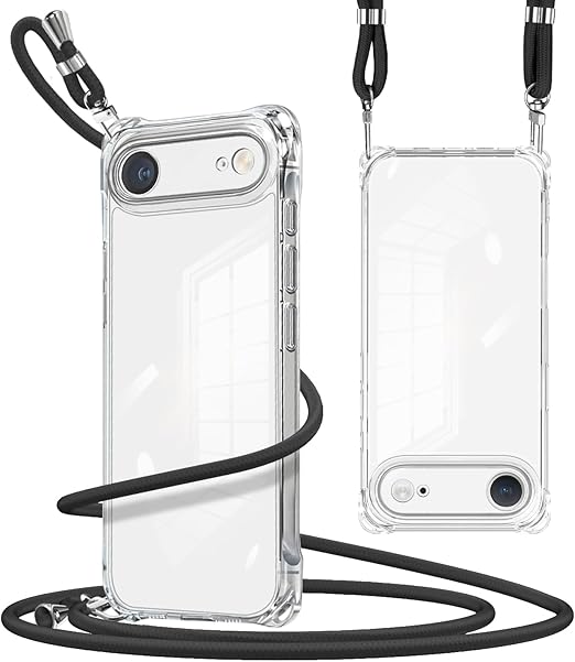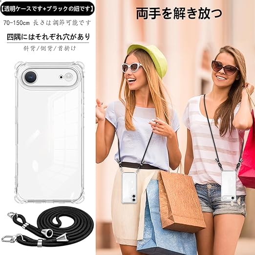 iPhone 17 Air 用の ケース ショルダー クリア アイフォン17 Air 用の スマホケース 肩掛け 斜めかけ 縄掛けケース 透明 薄型 軽量 TPU 携帯ケース 紐付き 斜めがけ 織りストラップ付き 長さ調整可能 取り外し可能 落下防止 紛失防止 (ブラック) a