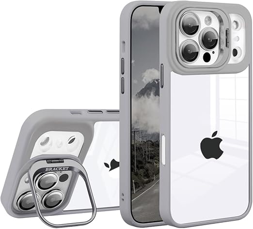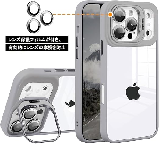JOOBOY スマホケース 対応 iPhone 17 Pro Max クリアケース 透明 レンズスタンド付き スタンド機能 レンズカバー付き PC背面+TPUバンパー おしゃれ 耐衝撃 ストラップホール付き アイフォン17プロマックス 携帯電話ケース (グレー, 17 Pro Max) a