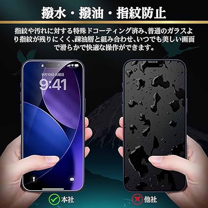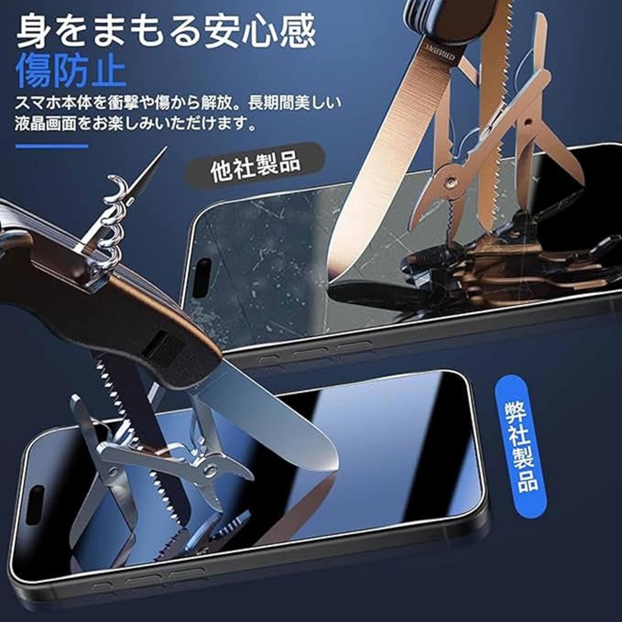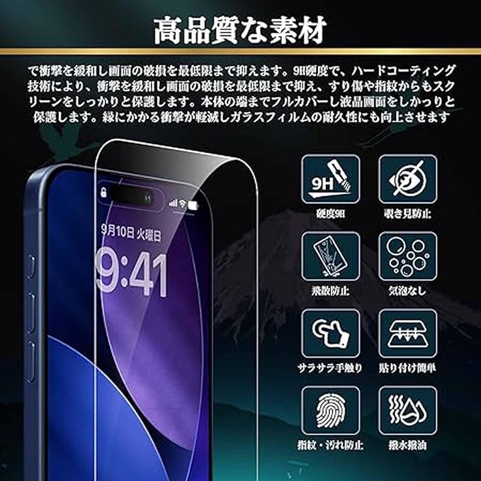 【強化素材製】ガラスフィルムは日本板哨子社製ガラス素材を採用し、強度が9Hであり、生活用品のほとんどが傷を付けることができません。万が一破損する場合にもほとんど飛び散らなく、とても安全です。