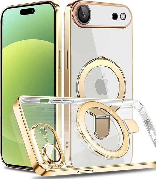 MuZiF iPhone 17 Air 用 ケース MagSafe対応 リング付き クリア メッキ加工 カバー 車載ホルダー対応 多機能 レンズ保護 薄型軽量 耐衝撃構造 透明柔らかいTPU アイフォン17 Air 用 磁気カバー クリアケース(iPhone 17 Air用,きんいろ) a