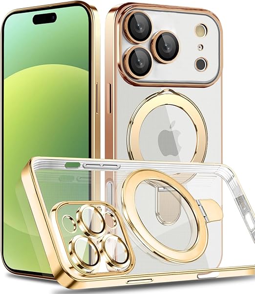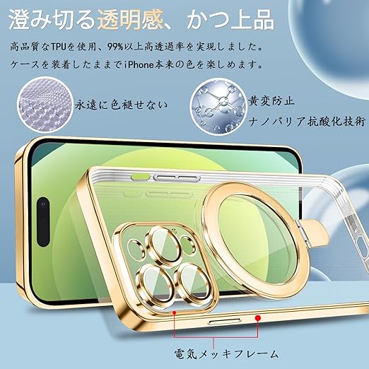 MuZiF iPhone 17 Pro 用 ケース MagSafe対応 リング付き クリア メッキ加工 カバー 車載ホルダー対応 多機能 レンズ保護 薄型軽量 耐衝撃構造 透明柔らかいTPU アイフォン17 Pro 用 磁気カバー クリアケース(iPhone 17 Pro用,きんいろ) a