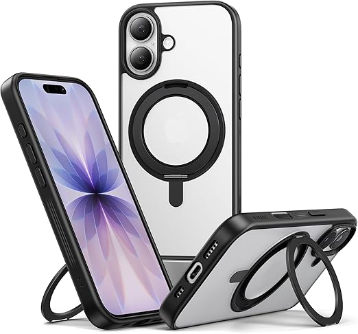 NIMASO iPhone 17 用 ケース 縦横両対応 360°回転スタンドケース いphone17 用 MagSafeアクセサリー対応 カメラコントロールカバー 携帯スマホケース リングマグネット搭載 ワイヤレス充電対応 半透明 防指紋 米軍MIL規格 耐衝撃性 ストラップホール付き アイフォン17 用 アジャスタブルスタンド ブラック(黒羽シリーズ)NSC25F1665 a