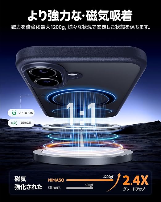 【強力な磁力吸着・高速充電】強力なマグネットが内蔵されており、差し込みのいらない超簡単充電を実現。マグネット部分は位置が正確に合致しており、ワイヤレス充電がこれまでよりもすばやく簡単に完了します。あいふぉん17を充電する時は、ケースを装着したままMagSafe充電器に取り付けるか、Qi規格の充電器の上に置くだけです。