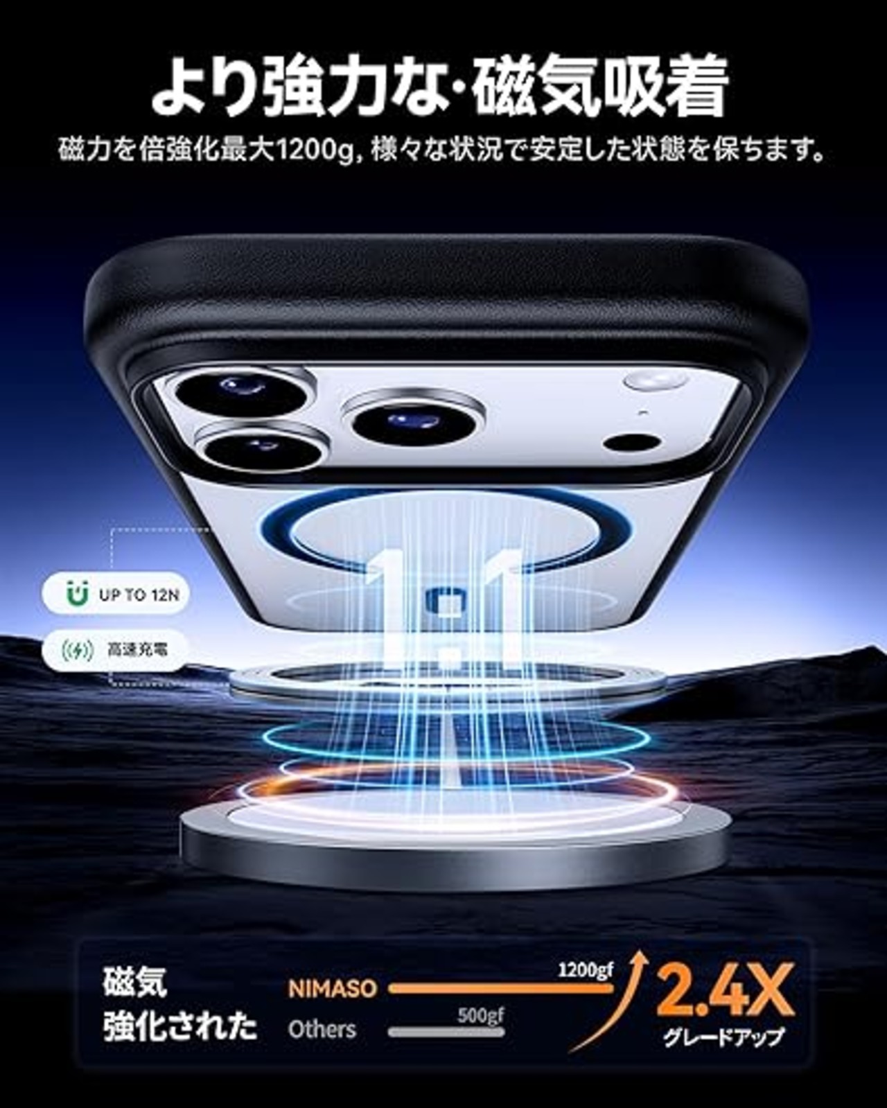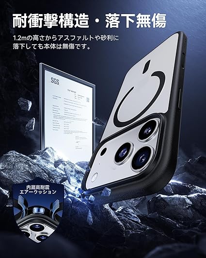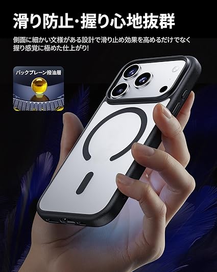 【強力な磁力吸着・高速充電】強力なマグネットが内蔵されており、差し込みのいらない超簡単充電を実現。マグネット部分は位置が正確に合致しており、ワイヤレス充電がこれまでよりもすばやく簡単に完了します。あいふぉん 17ProMaxを充電する時は、ケースを装着したままMagSafe充電器に取り付けるか、Qi規格の充電器の上に置くだけです。