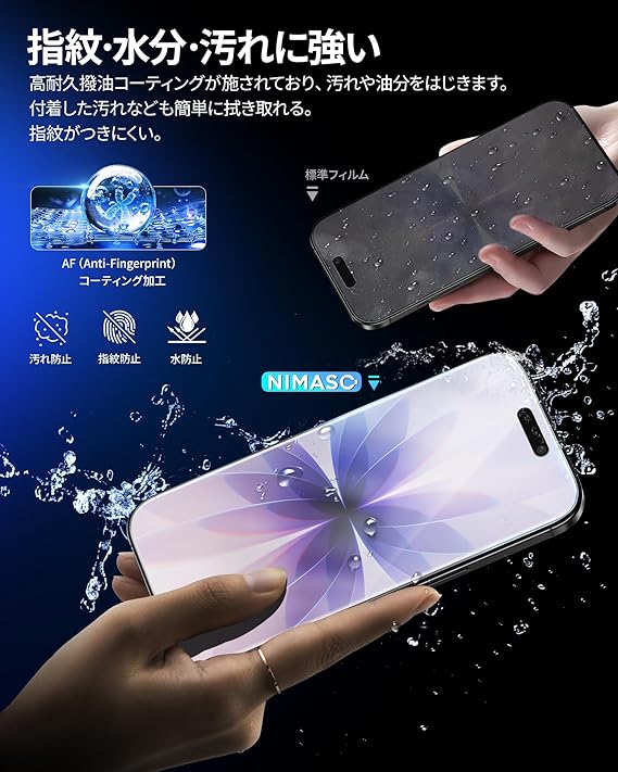 「指紋防止・なめらかなタッチ感度」指紋や油汚れを付着しにくくする撥水撥油コーティング(AF加工)と、操作感を滑らかにするスムーズタッチ加工を採用。付着した汚れも簡単に拭き取れ、動画視聴、作業、ゲームプレイなどあらゆるシーンで快適な操作