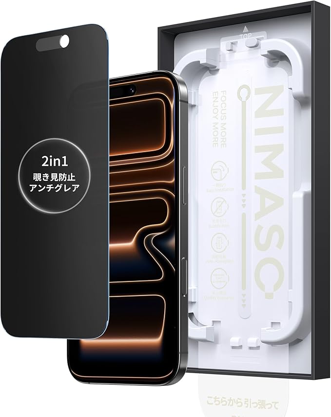 「2in1・多機能」NIMASOのいPhone17Pro Maxアンチグレア&覗き見防止機能を兼ね備えたガラスフィルムが登場!!!1枚のフィルムで2つの機能を実現しました。覗き見防止により、左右のからの視線を防ぎ、プライバシーを保護しながら、スクリーンの手触りがサラサラ快適。