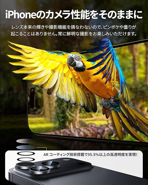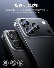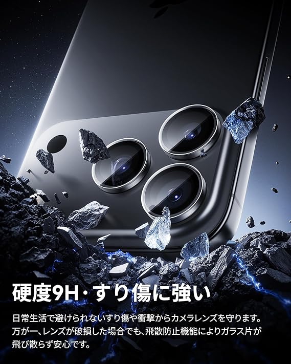 「カメラレンズをしっかり守る」9Hの高硬度強化ガラスを採用し、アイフォン 17プロ/ 17プロマックスのレンズをしっかり守ります。鍵などの硬く尖ったものが接触しても、簡単には傷がつきません。1.5メートルの高さから落下させるテストもクリアしており、万が一の時もレンズをしっかり保護します。また、飛散防止設計により、割れてしまった