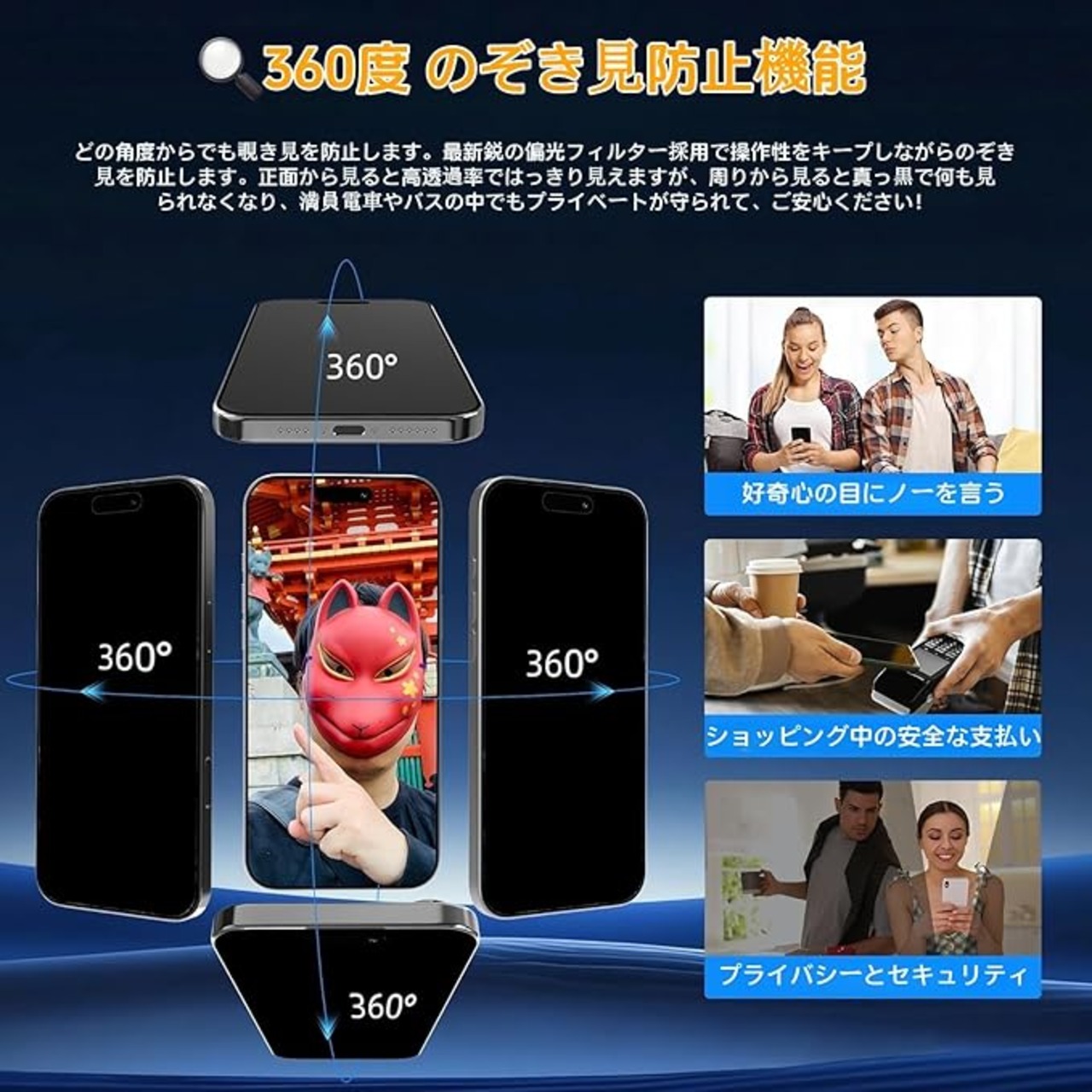 【360度のぞき見防止】上下左右4方向からの360度(前から約28度の視角)ののぞき見を防止します。正面からは画面がはっきり見え、高透過率でク