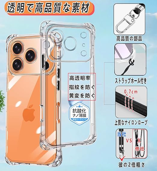 OJBSEN iPhone 17 Pro Max 用ケース アイフォン17プロマックスケース ショルダー【ストラップ2枚付き】肩がけ 首掛け 紐付き 斜めがけ スマホケースいPhone 17 pro max 薄型 透明 シリコン TPU 保護 バンパー ストラップホール付き [耐衝撃 米軍MIL規格]ワイヤレス充電対応 あいふおん17pro max カバー (クリア) a