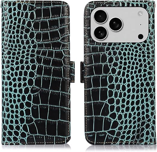 for iPhone 17 Pro max ケース 手帳型 本革 ワニ柄 アイフォン 17 プロ マックス 牛革 財布型 鰐柄 クロコダイル柄 耐衝撃 [RFIDブロッキング] カード収納 マグネット式ボタン 横置きスタンド機能 便利 財布型携帯 スマホケース 水色 Rureu a