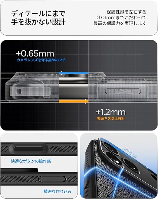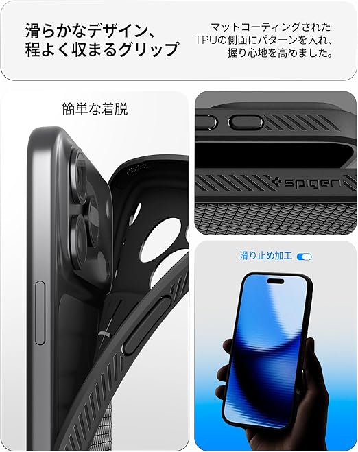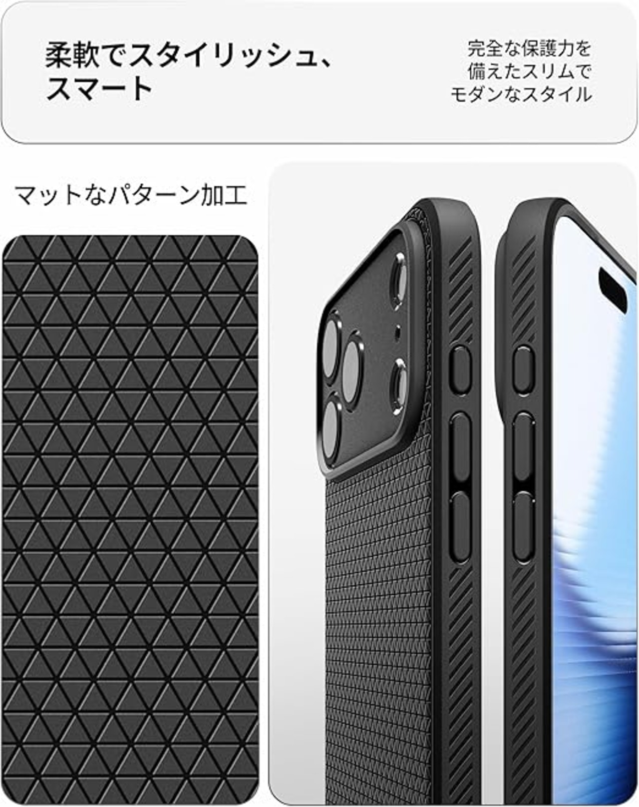 【高耐久のマット素材】マットな仕上げとジオメトリックなパターンが魅力的なリキッド・エア。装脱着が簡単になる柔らかいTPU(熱可塑性ポリウレタン)素材に衝撃を吸収するエアクッションを適用し、極めた保護力でデバイスを守ります。