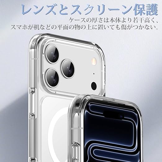 【レンズとスクリーン保護】ケースの厚さは本体より若干高く、スマホが机などの平面の物の上に置いても傷がつかない。iphone 17 pro maxが落下した際に液晶画面やレンズに傷が付かないようにする。