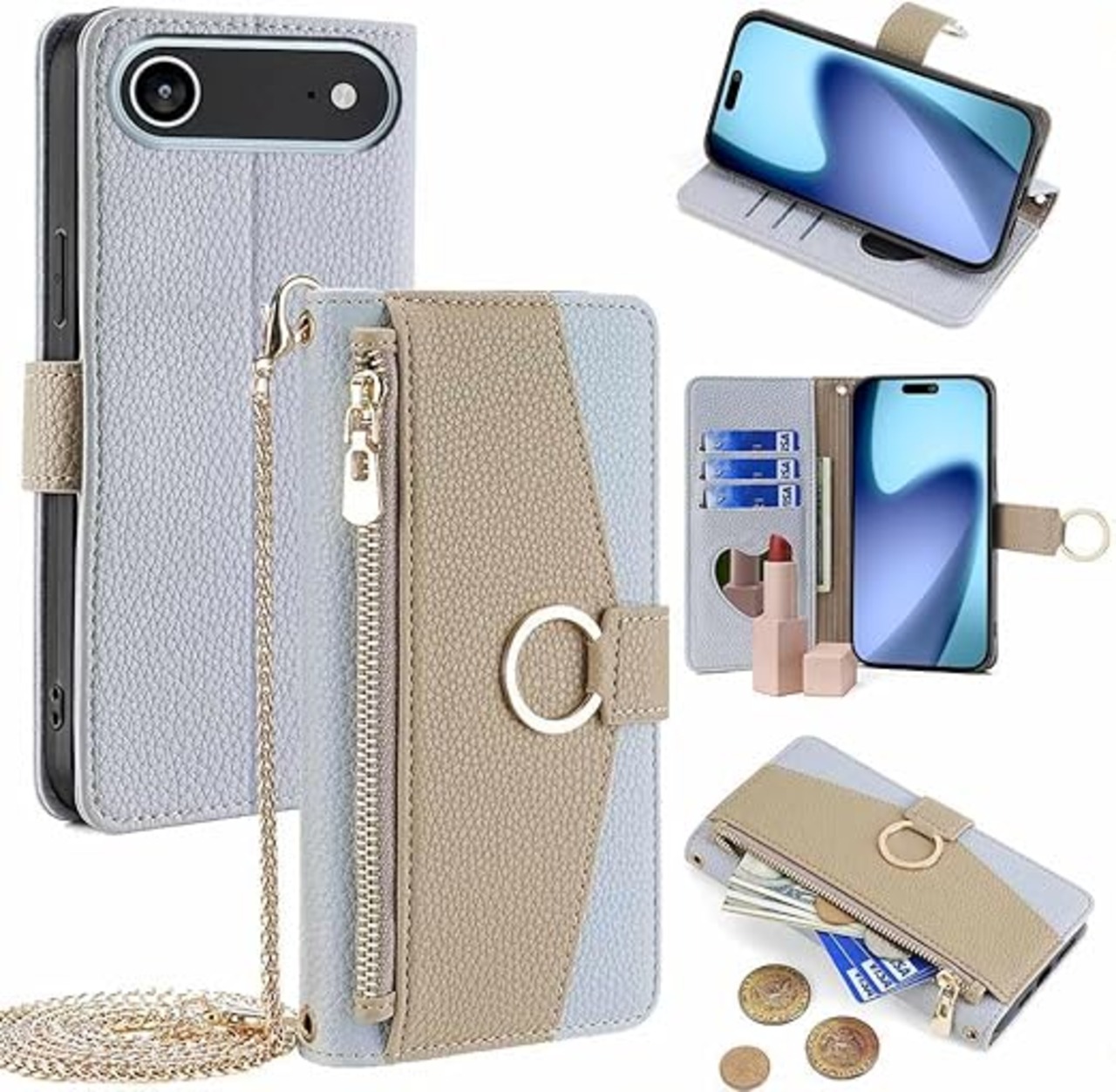 TOO&SOO 対応 iPhone 17 Air ケース 鏡付き いphone17air ケース ショルダー ストラップ付き アイフォン17エアー 携帯ケース スタンド機能 アイホン17air カバー カード収納 ミラー付き 耐衝撃 肩掛け あいふぉん17エアー スマホケース おしゃれ 女性 柔らかいTPU iPhone 17 Air ケース 手帳型 斜め掛け - ライトブルー a