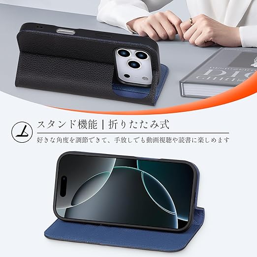 VISOUL iPhone 17 Pro 対応 ケース 手帳型 本革 アイフォン17 プロ 手帳型ケース MagSafe対応 スマホケース レザー カード収納 携帯カバー 横置きスタンド機能付き マグネット式 全面保護 柔軟なTPU素材 アイホン17 Pro ブラック・ネイビー a