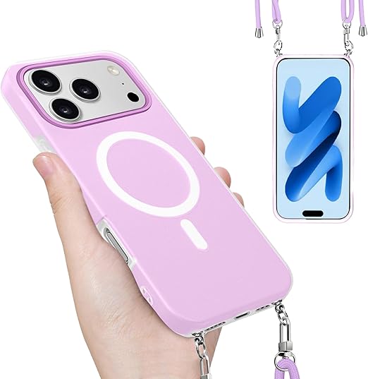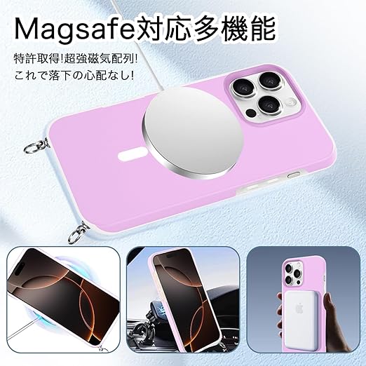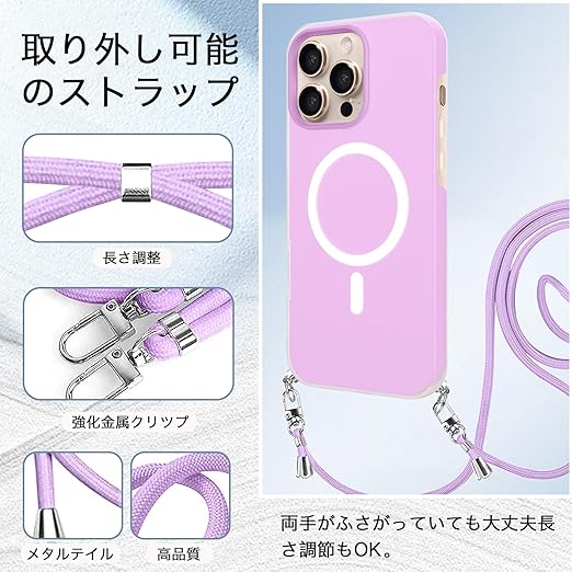 iPhone 17 Pro Max 用 ケース 【MagSafe対応】 バンパー ショルダー ストラップ付き 肩掛け 斜めかけ iPhone 17Pro Max 用 カバー TPU 薄型 韓国 アイフォン17 プロ MAX 用 スマホケース 可愛い 縄掛け (パープル) a