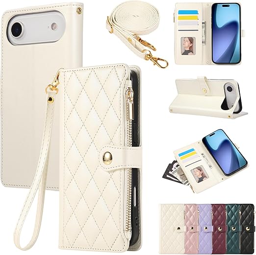 Yuotky for iPhone 17 Air ケース 手帳型 いphone 17 air ケース ショルダー iphone17エア スマホケース ひし形柄 アイフォン17 Air カバー 人気 女性 肩掛け iPhone 17Air カバー カード収納 ジップ付き財布 横置き機能 シンプル お洒落 携帯カバー (パールホワイト) a