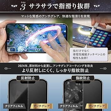 【対応機種】iPhone 17 Pro Max 対応【さらさらアンチグレア&ブルーライトカットのダブル属性タイプ】反射防止、指紋防止効果がありブルーライトカット率95%以上。黒縁付きの全面保護仕様です。【セット内容】iPhone 17 Pro Max 用 ガイド枠(早ピタBOX)付き強化ガラスフィルム×1、交換用強化ガラスフィルム×1、拭き上げキット×2、気泡除去用スクレーパー×1、説明書×1