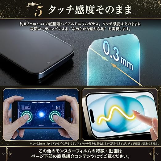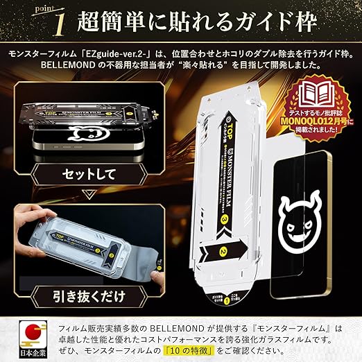 【モンスターフィルムの開発理由】フィルムの貼り付けにおいて、「貼り付け失敗」の声が最も多く寄せられました。失敗を徹底的に排除するため、研究や試作を重ねて完成したのが「モンスターフィルム EZguide-Ver.2-」です。【EZgu