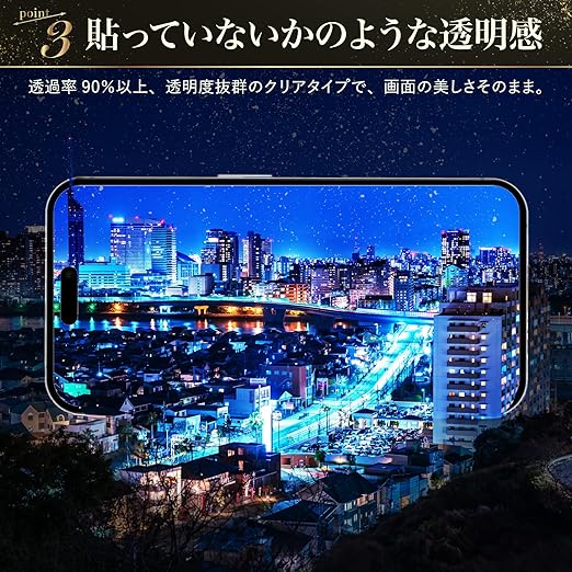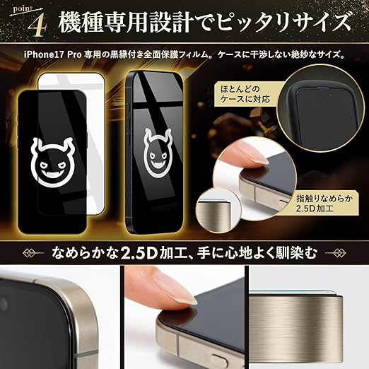 【対応機種】iPhone 17 Pro に対応しています。【クリアタイプ】定番の超透明・高透過率フィルム。黒縁付きの全面保護仕様です。【セット内容】アイフォン17 プロ用のガイド枠付き強化ガラスフィルム×2、拭き上げキット×2、気泡除去用スクレーパー×1、説明書×1