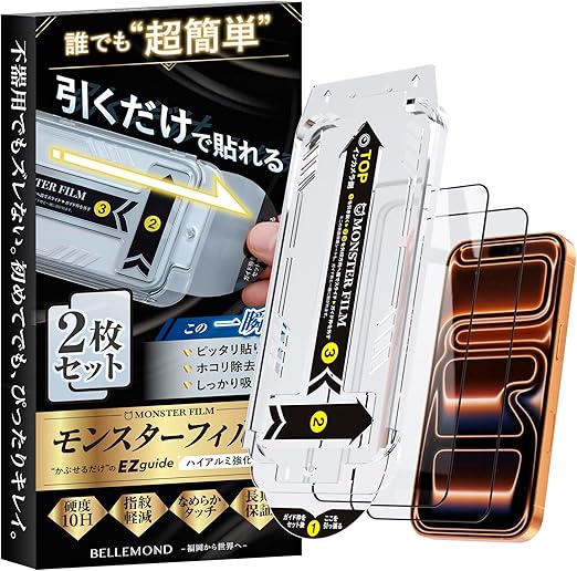 モンスターフィルム iPhone 17 Pro 用 クリア ガラスフィルム | 2枚セット ガイド枠付き 黒縁あり 全面保護 | 貼りやすい アイフォン 17 プロ 用 保護フィルム B1668 a