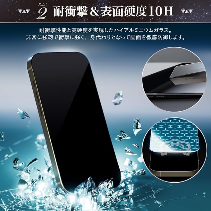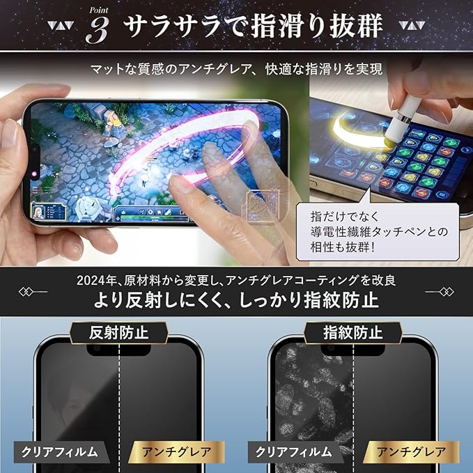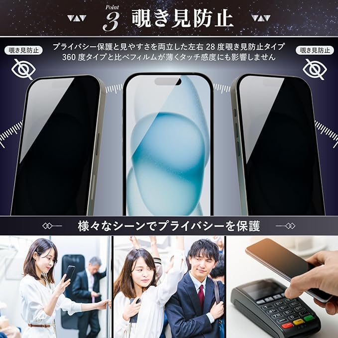 【対応機種】iPhone 17 / 16Pro 対応 【さらさらアンチグレア&覗き見防止のダブル属性タイプ】反射防止、指紋防止、視野角が左右約28°を超えると画面が暗くなります。黒縁付きの全面保護仕様です。※上下覗き見防止(360度)ではありません。【セット内容】アイフォン 17 / 16 プロ用 ガイド枠(早ピタBOX)付き強化ガラスフィルム×1、交換用強化ガラスフィルム×1、拭き上げキット×2、気泡除去用スクレーパー×1、説明書×1