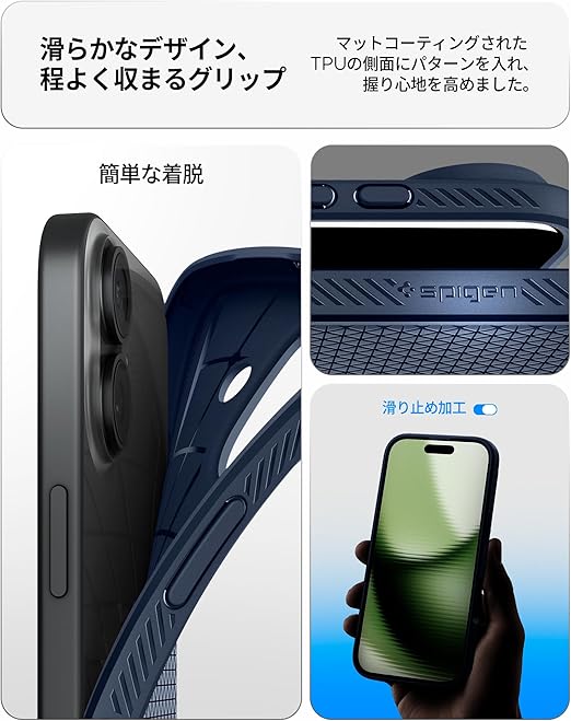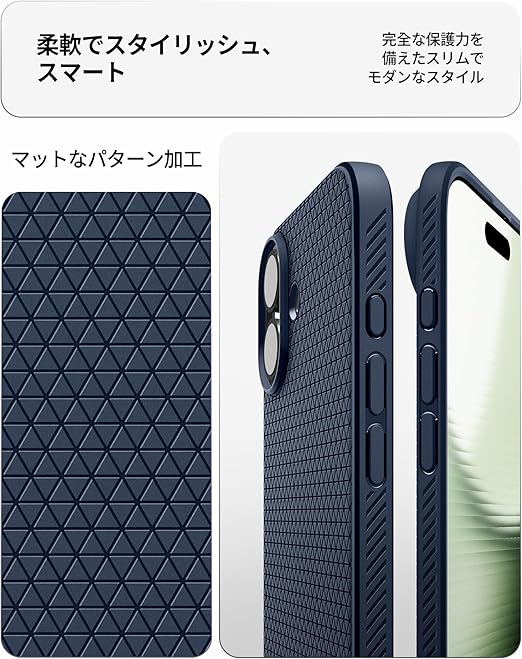 【高耐久のマット素材】マットな仕上げとジオメトリックなパターンが魅力的なリキッド・エア。装脱着が簡単になる柔らかいTPU(熱可塑性ポリウレタン)素材に衝撃を吸収するエアクッションを適用し、極めた保護力でデバイスを守ります。