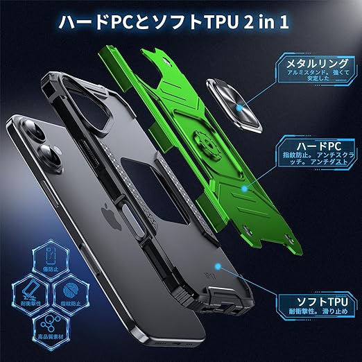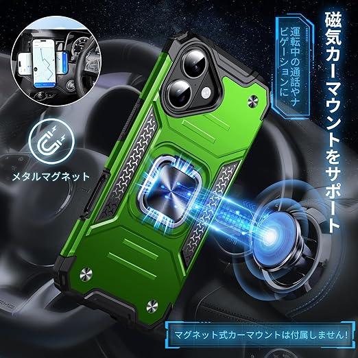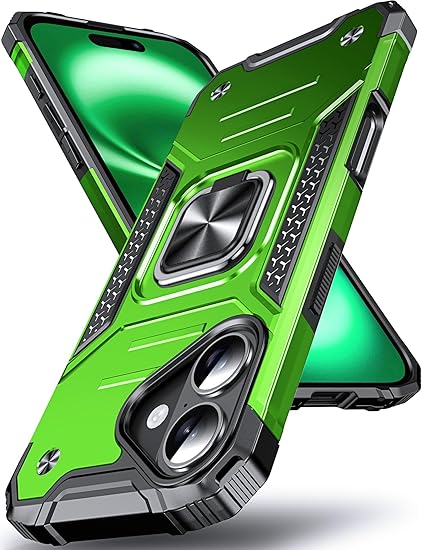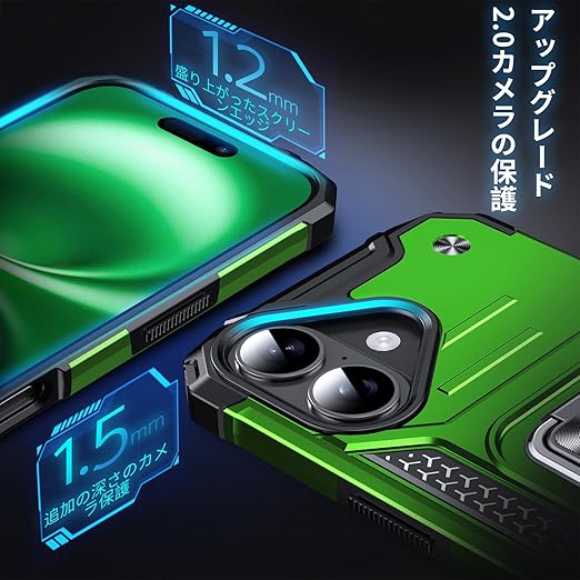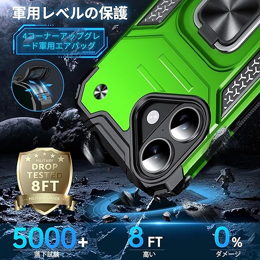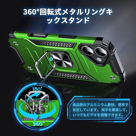 DASFOND iPhone 17 用 ケース 360度回転メタルリングキックスタンド付き 米軍MIL 耐衝撃 強化PCハードバック 傷つけ防止 スマホケース アイフォン17 カバー 6.3 インチ グリーン a
