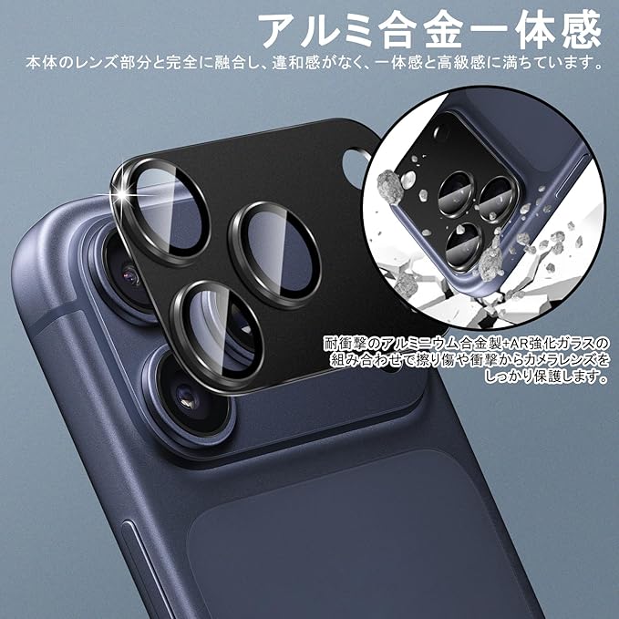 【アルミ合金一体感】本体のレンズ部分と完全に融合し、違和感がなく、一体感と高級感に満ちています。耐衝撃のアルミニウム合金製+AR強化ガラスの組み合わせで擦り傷や衝撃からiphone 17 proカメラレンズをしっかり保護します。