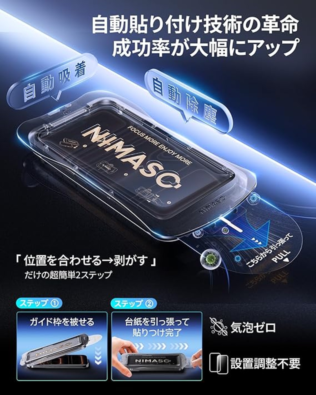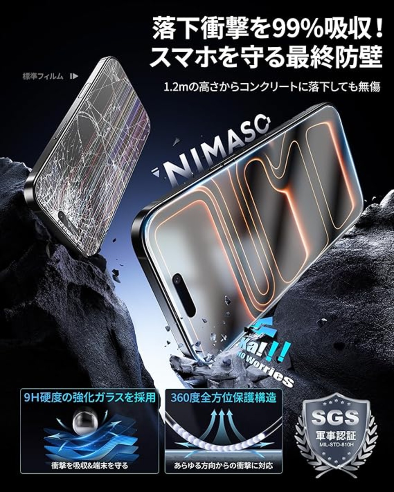 「反射低減・視認性向上」: NIMASO独自の反射防止コーティングを施し、太陽光や室内照明の画面への映り込み・反射を効果的に抑制。画面の視認性を高め、長時間の使用でも目の疲労を軽減し、目を保護します。