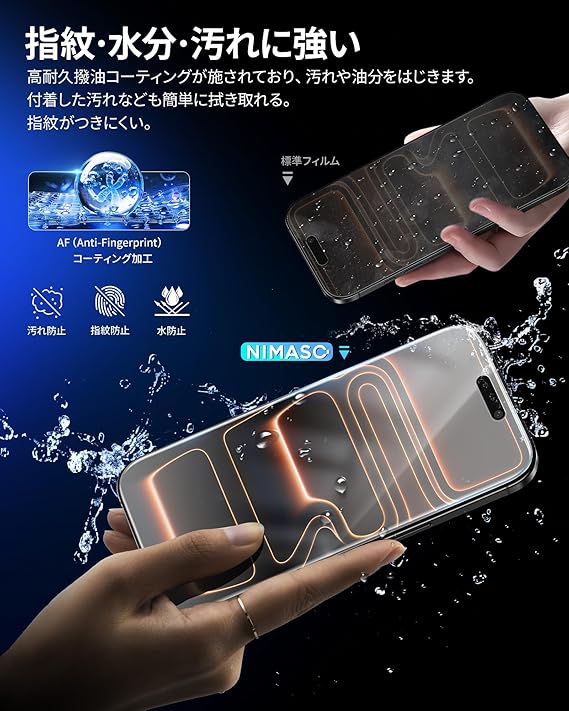 「指紋防止・サラサラなタッチ感度」:指紋や油汚れを付着しにくくする撥水撥油コーティング(AF加工)と、操作感を滑らかにするスムーズタッチ加工を採用。付着した汚れも簡単に拭き取れ、動画視聴、作業、ゲームプレイなどあらゆるシーンで快
