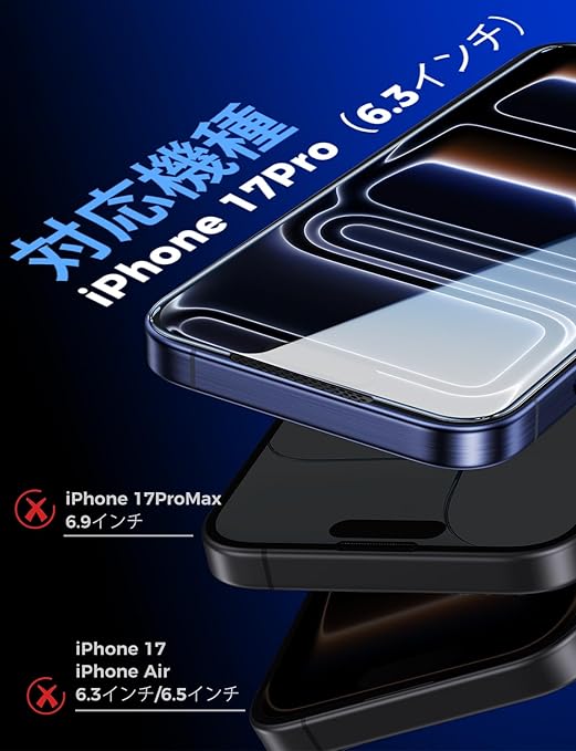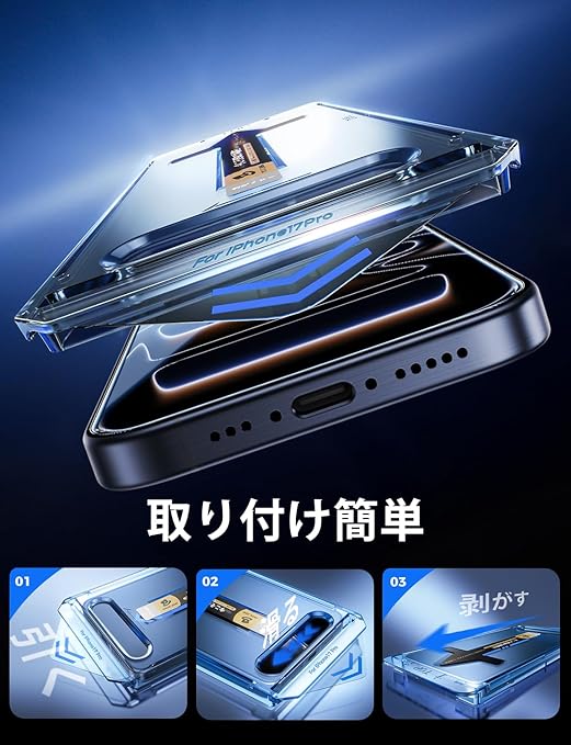 【もう失敗はしない】本製品は対応 iPhone 17 Proに対応するガラスフィルム2枚セットです。百万以上の欧米ユーザーのフィドバックを集めて日々改善したガイド枠は、3歩だけで保護フィルムを貼り付けます。そのうえ、自動ホコリ取りデザインだけでなく、ガイド枠のスロープデザインで、空気を順序に取り除くことができて、初心者でも気泡レスのまま綺麗に貼れます。
