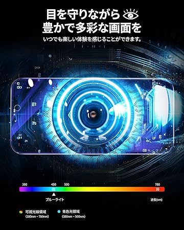 「ブルーライトカット・目の疲れ軽減」ブルーライト反射技術によりブルーライトを大幅にカットすることで、目の疲れを軽減します。長時間スマートフォンの画面を見たり、ゲームをしたりする方におススメです。(ご注意:ブルーライトカットの加工で、使用角度や環境によって、淡い黄色や薄い紫色に見える場合がありますので予めご了承下さい。)