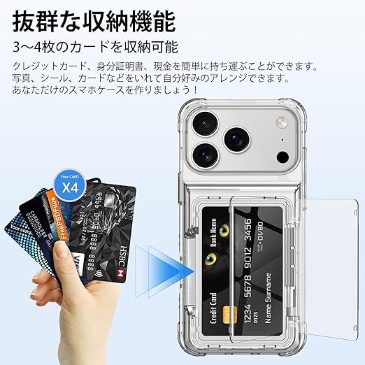 【カード収納】いPhone17ProMax 用 ケースは3-4枚のカードを安全に保管することができる。財布を持ち出す必要がなく、身分証明書、クレジットカード、現金を簡単に持ち運ぶことができます。また、写真、シール、カードなどをいれて自分好みのアレンジできます。あなただけのスマホケースを作りましょう!