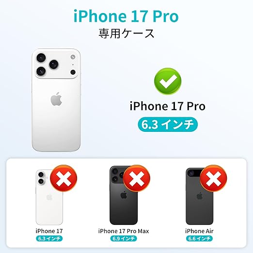 【高品質の材料、優れた技術】iPhone 17 Pro 用ケースは高品質で柔らかいTPUと硬質PC材料で作られており、感触が快適で、長持ちし、予想外の落下による損傷を防ぐことができる。9Hガラス/航空アルミニウム合金カメラレンズ保護ケースを備え、軍用級保護を提供する。