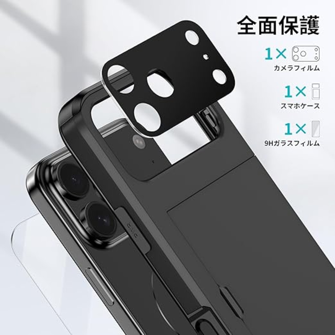 COOLDEN いphone17Pro ケース カード 収納 背面 対応 iPhone 17 Pro ケース 手帳型 カード入れ 【ガラスフィルム + カメラフィルム】 米軍MIL規格 耐衝撃最強 カバー 落下防止 全面保護 指紋防止 マット質 スマホケース 対応 iPhone17プロ あいふぉん17ケースpro ブラック a