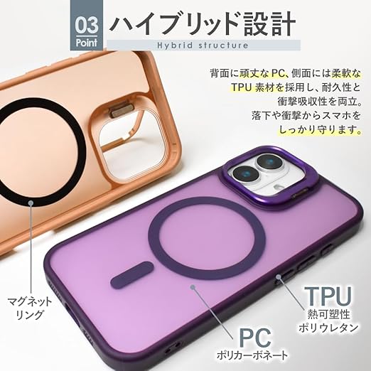 シズカウィルRe iPhone 17 ケース MagSafe対応 マット カバー ワイヤレス充電 耐衝撃 スタンド付き ハイブリッド5 スマホケース パープル 1個入り a