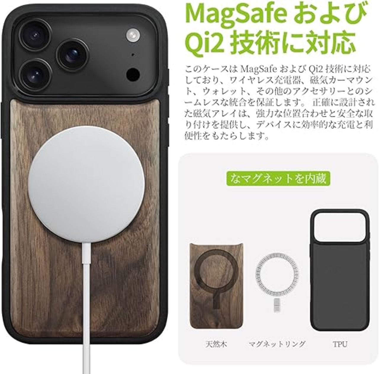 「製品構成」軽量で保護機能を兼ね備えた木製の17 Pro スマホケースです。天然のウッドチップと高品質のソフト TPU(熱可塑性ポリウレタン)をベースに作られており、美しい外観だけでなく、保護機能も優れています。原木製パネルはその個性を際立たせます。つまり、製品によって木目模様が異なるため、製品を受け取った時、その独特で自然な美しさを感じることができます。