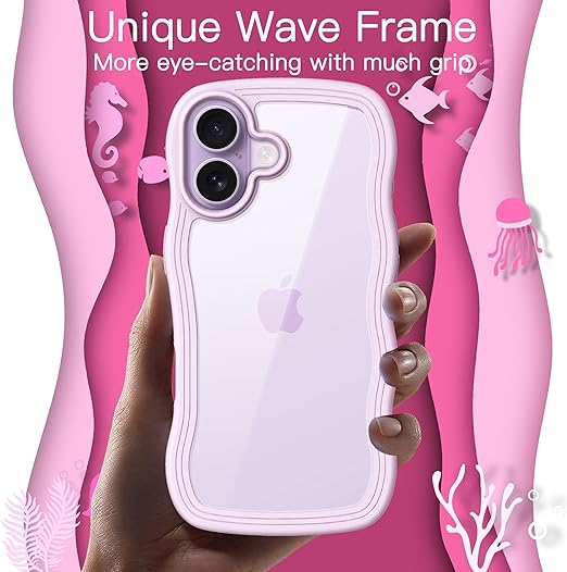 JETech iPhone 17 6.3インチ用 ウェーブ ケース かわいい 波状フレーム うねうね 耐衝撃 スマホカバー 女性用 女子向け クリア ハードPCバック (パープル) a