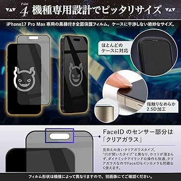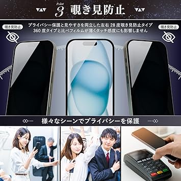 【対応機種】iPhone 17 Pro Max 対応 【覗き見防止タイプ】視野角が左右約28°を超えると画面が暗くなり、プライバシーを守ります。黒縁付きの全面保護仕様です。※上下覗き見防止(360度)ではありません。【セット内容】アイフォン 17 プロマックス用 ガイド枠(早ピタBOX)付き強化ガラスフィルム×1、交換用強化ガラスフィルム×1、拭き上げキット×2、気泡除去用スクレーパー×1、説明書×1