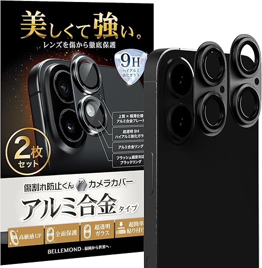 ベルモンド iPhone 17 用 | レンズカバー カメラカバー カメラフィルム レンズフィルム カメラ保護 カバー 全面保護 レンズ 9H 強化ガラス | アルミ合金製 黒 ブラック 2枚セット B1662 a