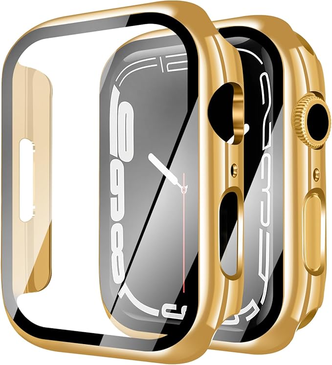 YUGYUG 対応 アップルウォッチ カバー Series 11/10 アップルウォッチ ケース PC素材 光沢式 Apple Watch ケース ガラスフィルム 一体型 日本旭硝子材 二重構造 Apple Watch カバー 全面保護 強化ガラス キズ防止(46mm,ゴールド) a