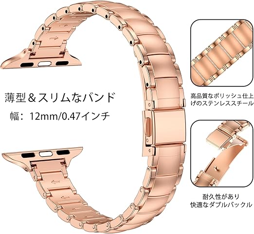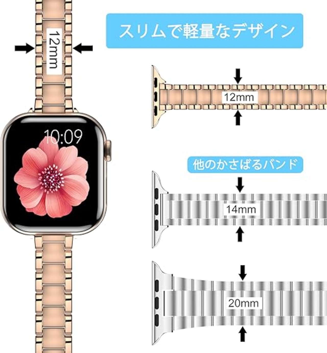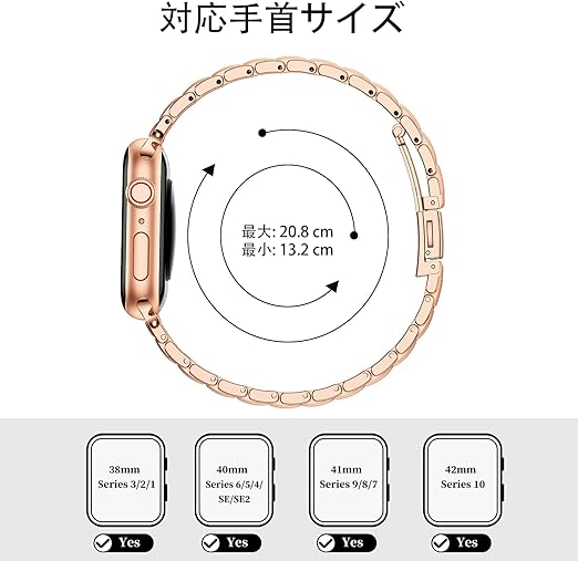 対応モデル: 当社のスリムなメタルバンドはApple Watch バンド Series 11/10(42mm)、Series 9/8/7(41mm)、Series 6/5/4/SE3/SE2/SE(40mm)、およびSeries 3/2/1(38mm)に対応しています。49mm、46mm、45mm、44mmサイズ、ならびにSeries 3/2/1の42mmモデルには対応しておりません。時計本体は含まれておりません。